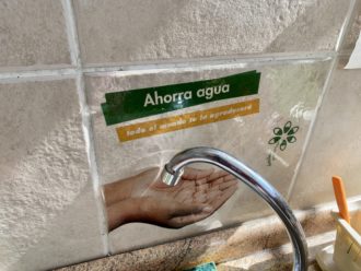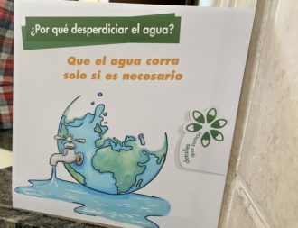 Para los pilares de consumo de electricidad y agua se elaboró material gráfico para concientizar constantemente al personal. Estas imágenes se colocan cerca de lavamanos, lavaplatos e interruptores de luz para evitar el malgaste de agua y electricidad, y cerca de los ascensores para incitar a usar las escaleras en los casos que sea posible.