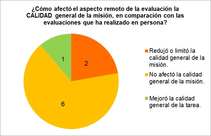 Sean las misiones más cortas o largas, muchos de los entrevistados estimaron que el realizar evaluaciones de manera remota no redujo el nivel de calidad en comparación con las evaluaciones en persona. Alabaron la existencia de herramientas de visioconferencia que les permitieron realizar las entrevistas de una manera relativamente animada, mientras que reconocieron que uno primero necesita familiarizarse con dichas herramientas para aprovecharlas al máximo. Carla Aguirre Marinovic incluso considera que “de cierta manera, mejoró el servicio proporcionado, ya que pude brindar asistencia técnica adicional a las instituciones de manera personalizada.” Las evaluaciones remotas pueden, de hecho, realizarse por un período más largo de tiempo con llamadas regulares adaptadas a las limitaciones de horario, la capacidad de integración y la agenda de la institución, en lugar de concentrarse durante una semana intensiva de visita en el campo.